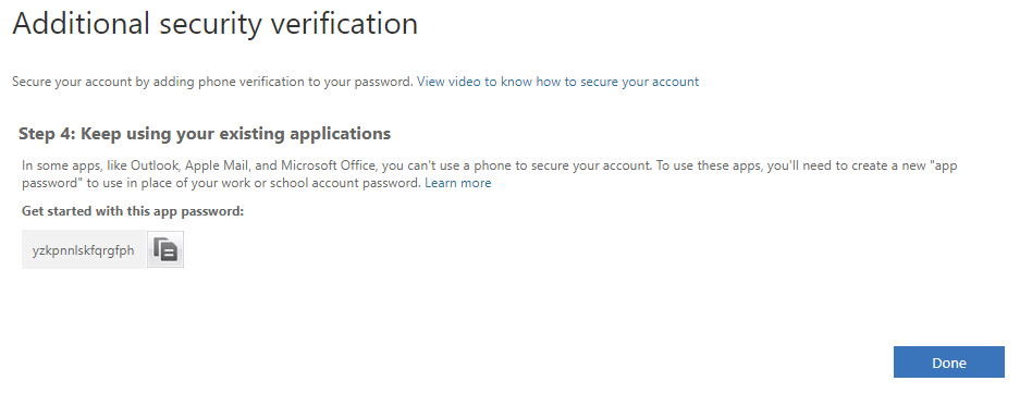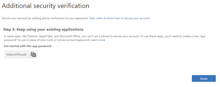 The next page will show you the app password and given you aren’t meant to write it down it makes sense to set your email up now. Or use Outlook of course. We really recommend you at least try Outlook before you decide you don’t like it. It has improved beyond recognition and I actually prefer it now but each to their own.