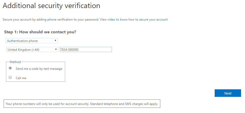 Select "Send me a code by text message", and enter your country code and mobile number (without the zero). Press Next.