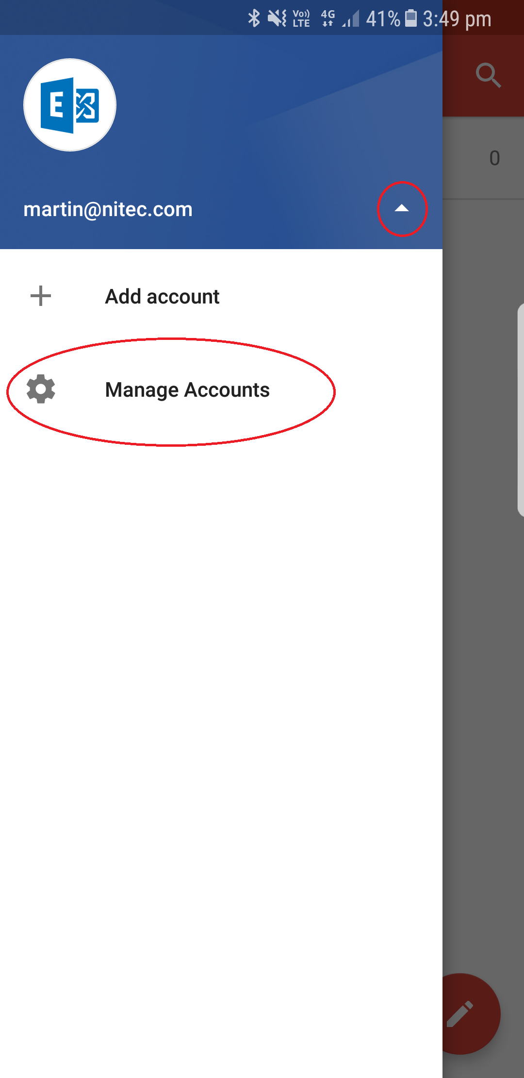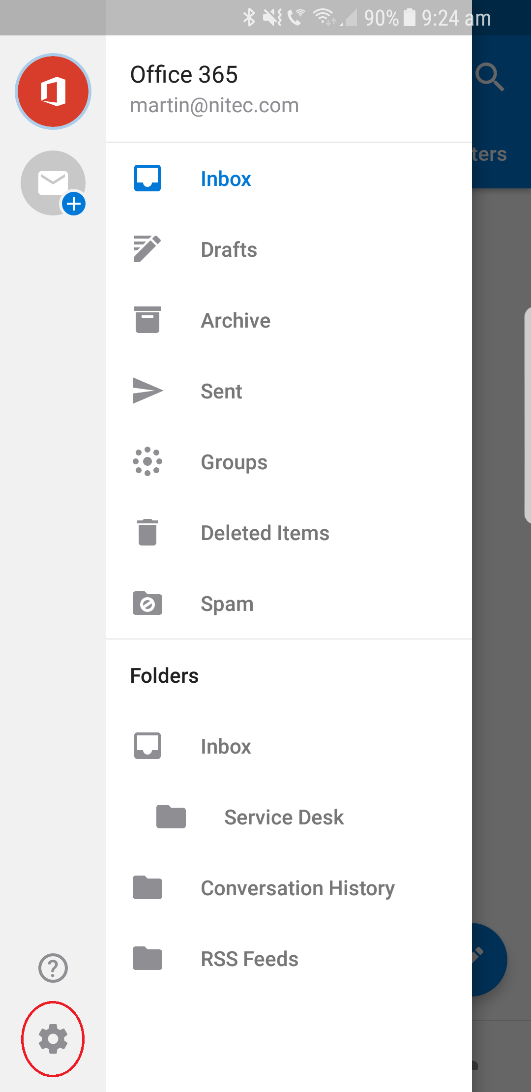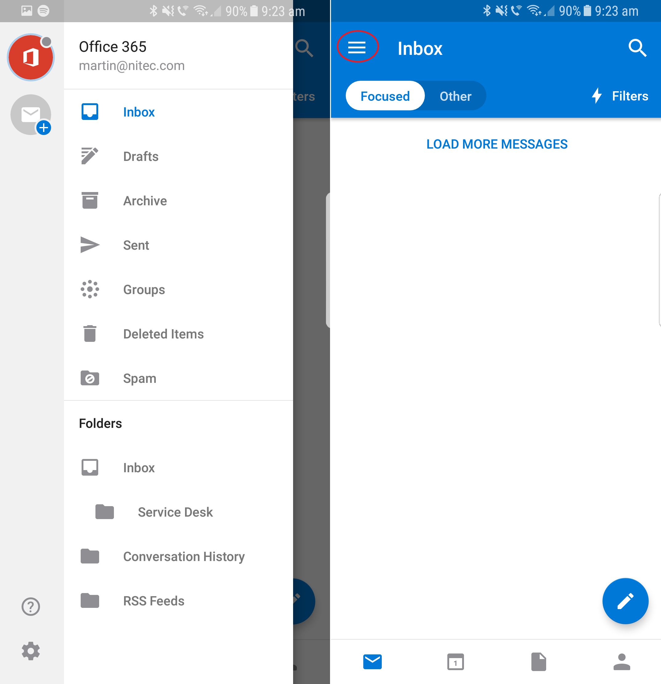 Below is a split screen of what Outlook will now look like, on the right is your main mail screen and if you left the circled menu button the menu will appear as shown on the left side of the screen. This will allow you access to your different mail accounts and folders.
