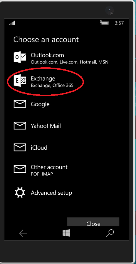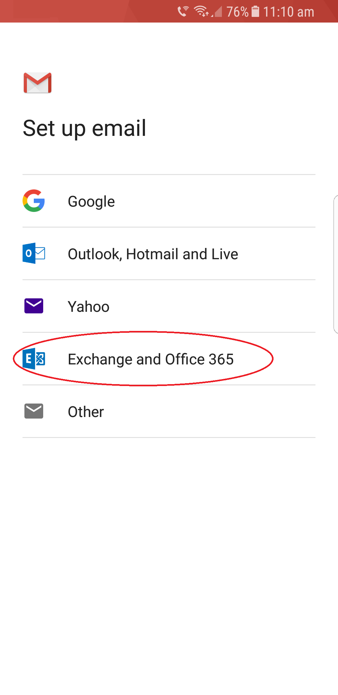 This will bring up a list of mail providers. For most of you the type you are looking for is Exchange. (This covers Office 365 as that’s what Office 365 is at the back end. Exchange Online).