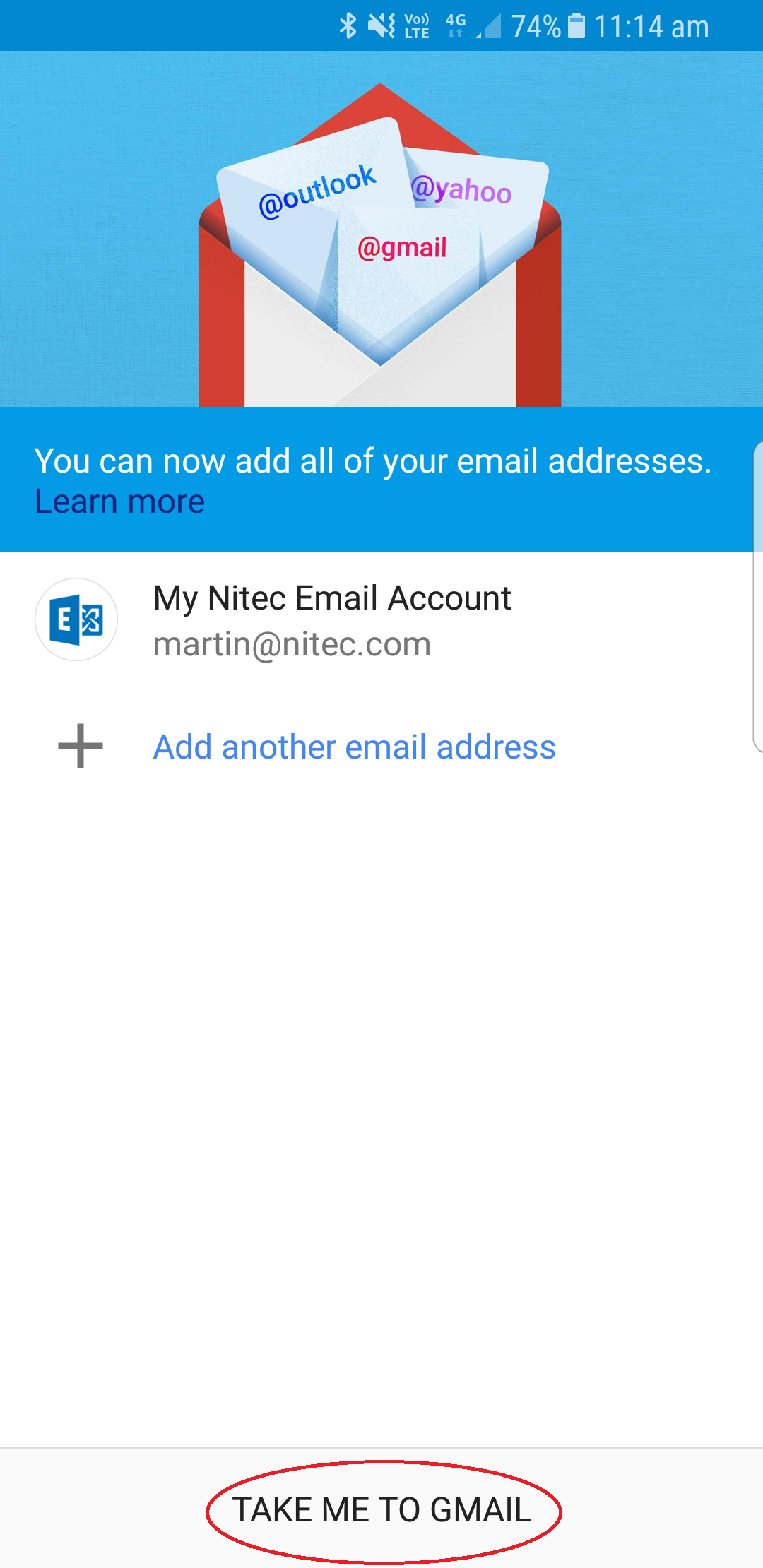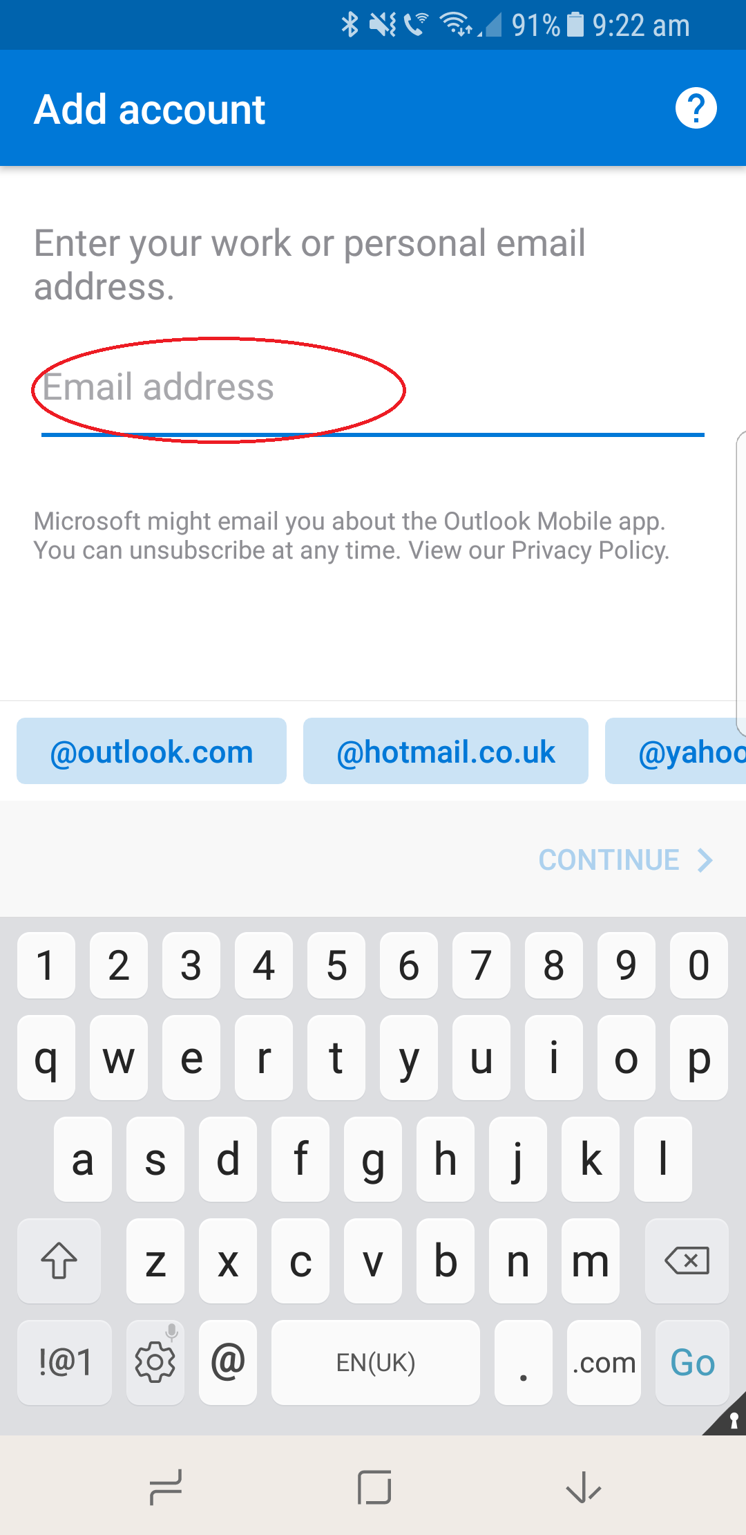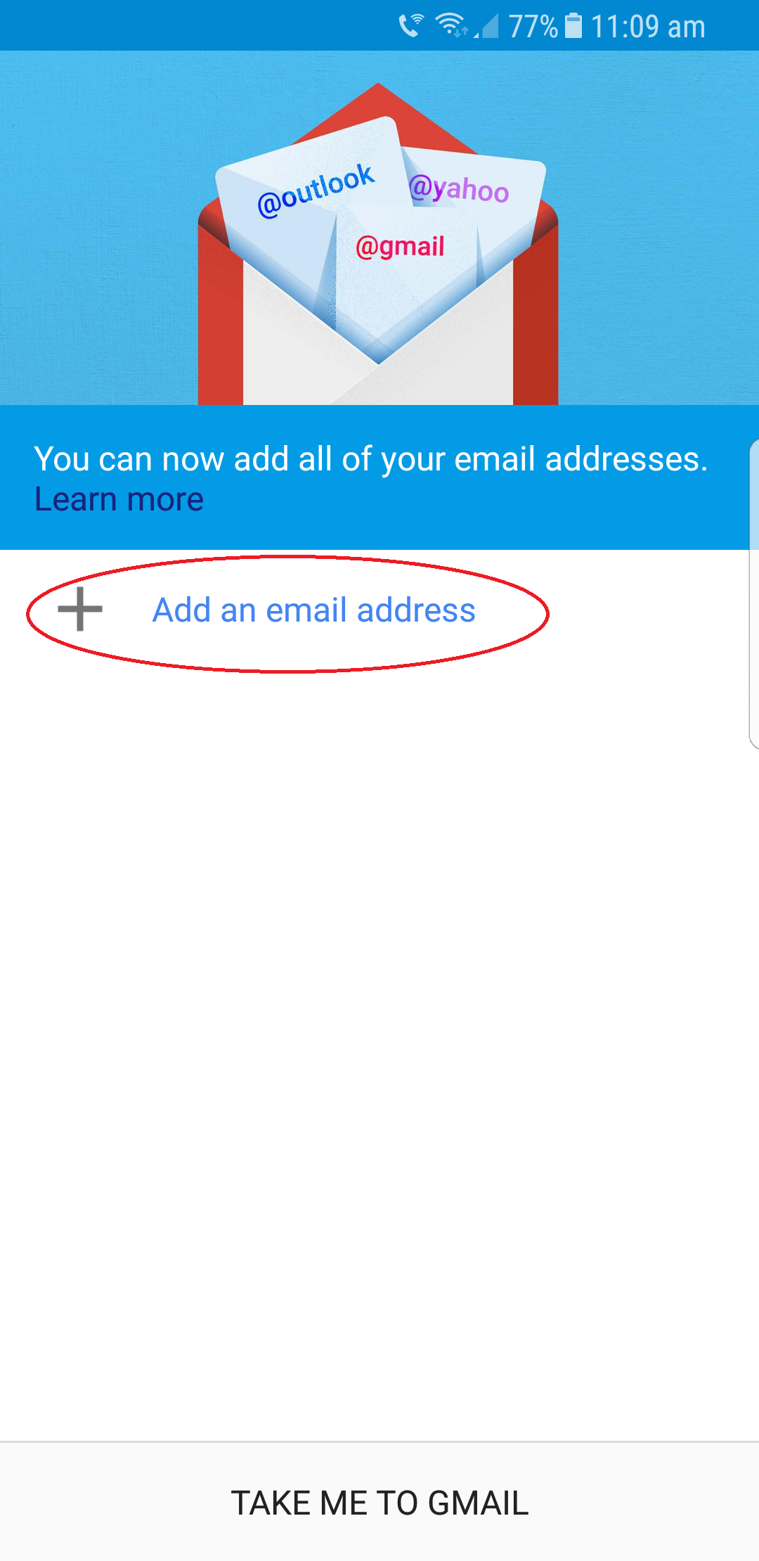 Select 'Add an email address' - This will allow you to add your desired email account to your phone
