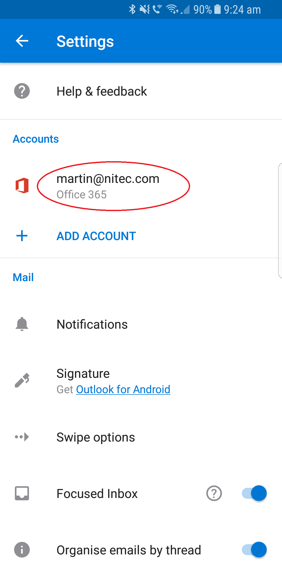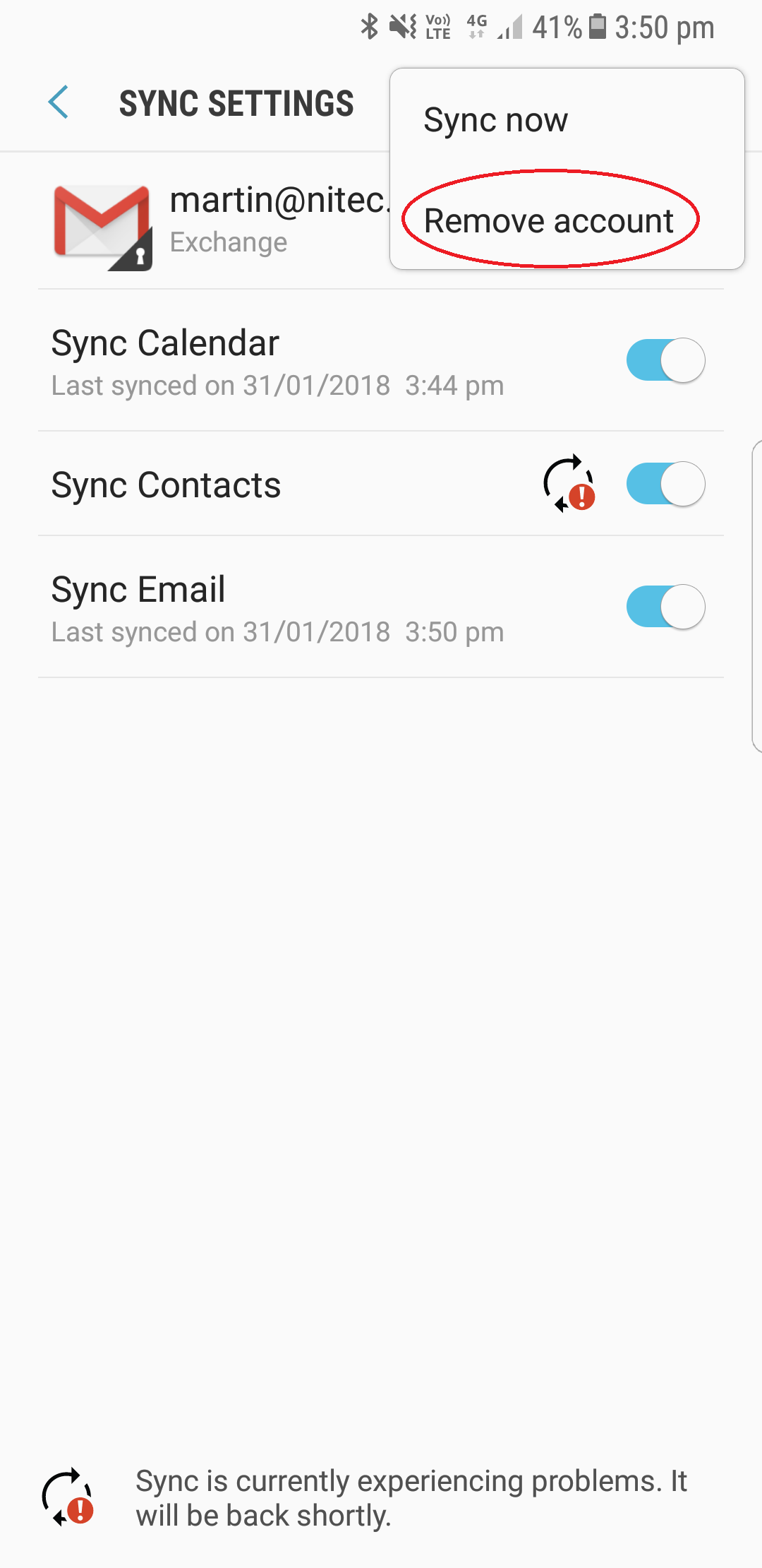 Note: You can see that I have an error message at the bottom of the screen stating 'Sync is currently experiencing...' This is because I have enabled Two Factor Authentication on my own account and I havent setup the email account yet with an App Password to bypass this.